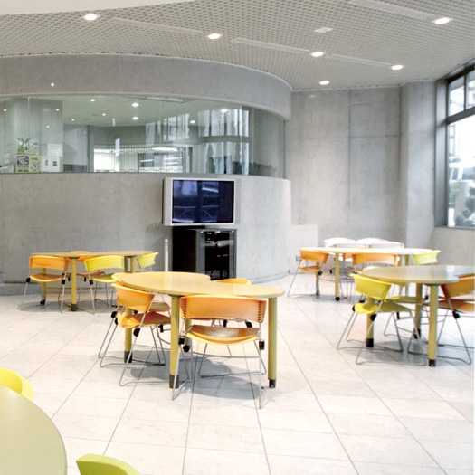 可以自由使用的宽敞空间,中央设置的显示屏上,以校内外的公演为中心发送影像和文字信息。