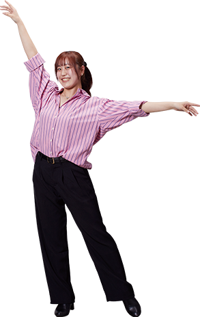 ダンスの大好きな仲間たちとSHOBIで出会い、毎日刺激を受けながら、一緒になって切磋琢磨しています。先生方も学生一人ひとりとしっかりと向き合ってくださるので、入学後にさらにダンスが好きになリました。ダンスは踊る人によって表現が大きく変わってくるものなので、これからもっといろいろなダンサーと出会って、表現の仕方を見て、自分のダンスの幅をどんどん広げていきたいと思っています。
