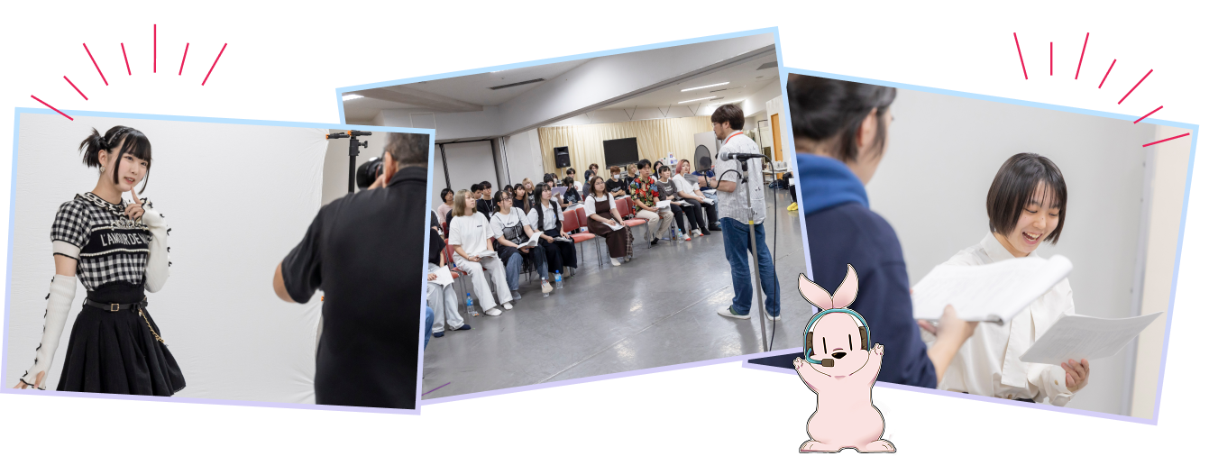 大手声優事務所、プロダクション、劇団の方を学校にお招きしてオーディションを行います。