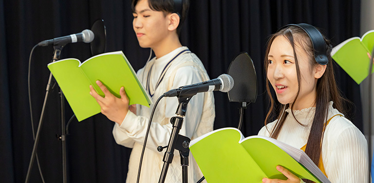 上演や舞台制作を通して、俳優としての全身表現はもちろん、声優として身体全体の演技を声に凝縮して伝える力を養います。さらに、アニメや海外ドラマのアテレコ・アフレコ、多様なジャンルのナレーション、朗読を実践し、現場で役立つスキルを身につけます。
