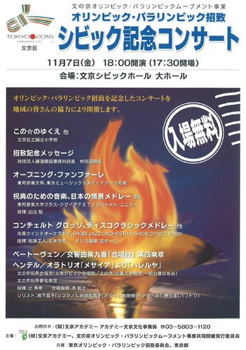 このコンサートは、オリンピック・パラリンピック招致を記念して、地域の皆さんの協力により開催されるコンサートです。