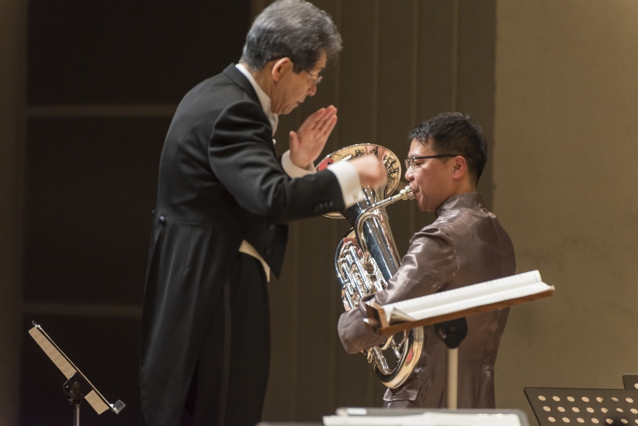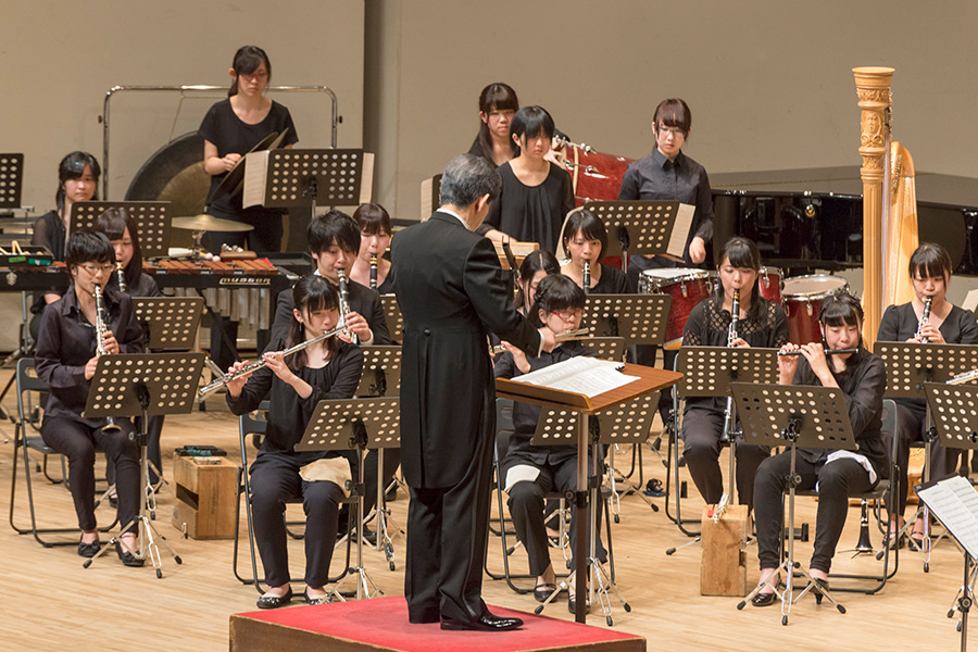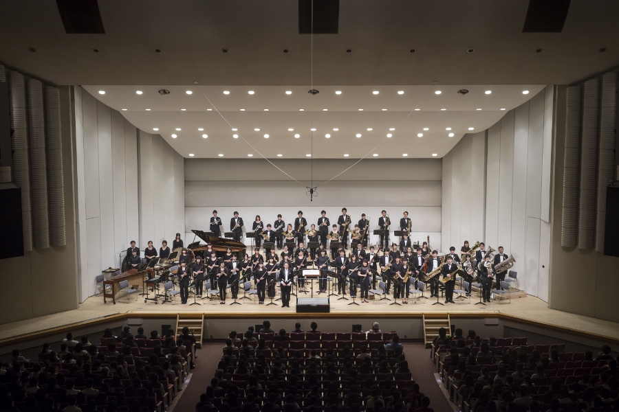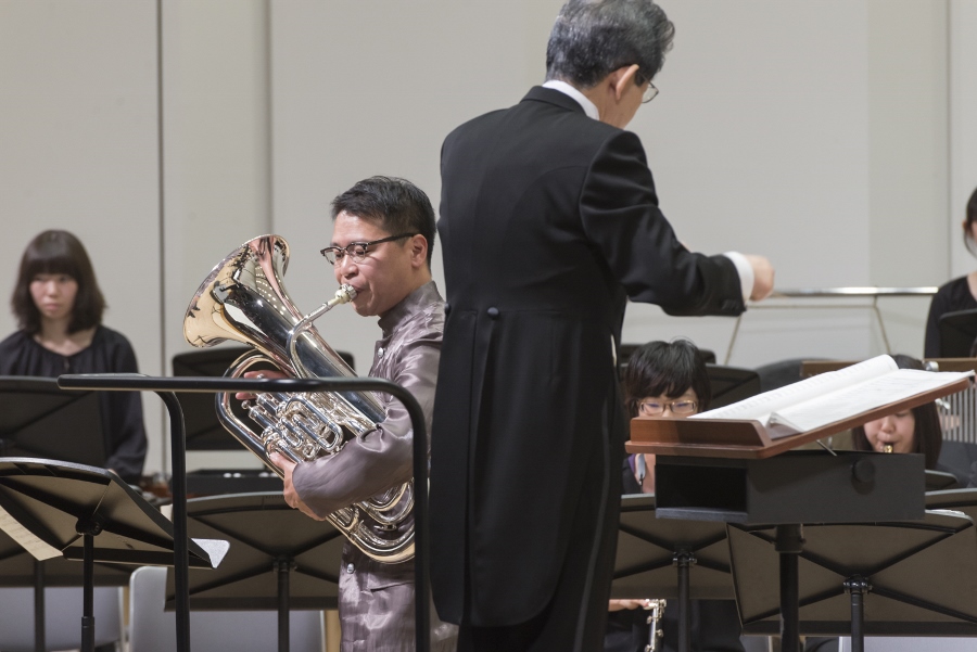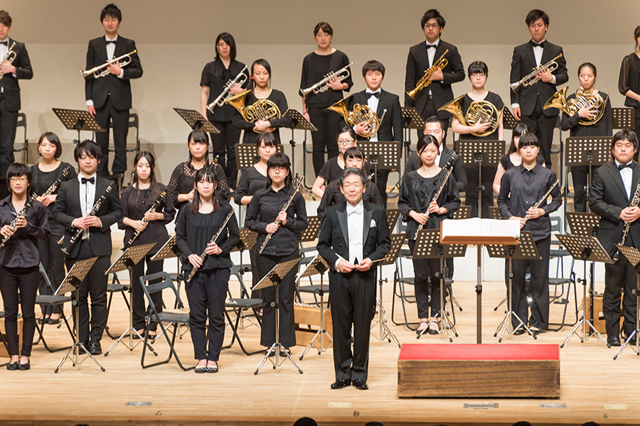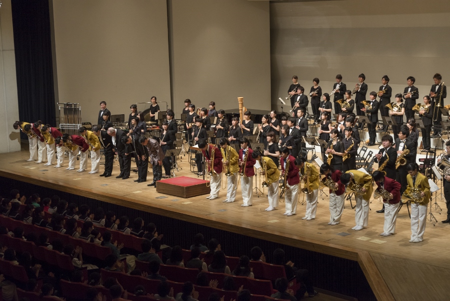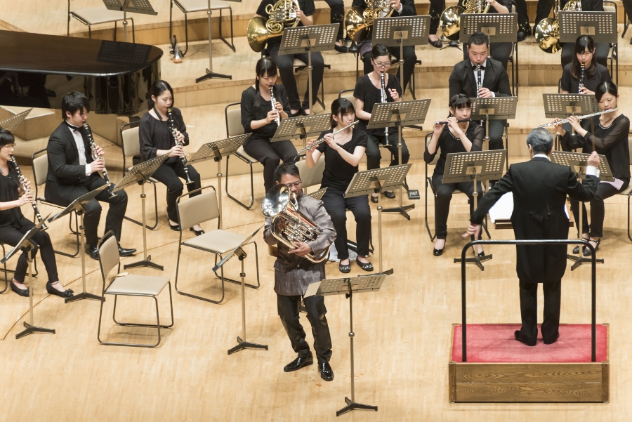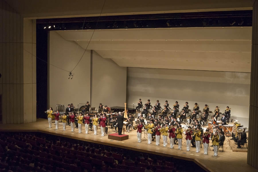 本学の創立90周年記念行事の一環として行われたこの演奏会では、指揮者に小澤 俊朗先生、世界的な作曲家 ジェイムズ・バーンズ氏をはじめ、日本を代表する演奏家であり、また本学の卒業生でもあるユーフォニアム奏者 外囿 祥一郎先生、サクソフォーン奏者 原 博巳先生にもソリストとして出演していただきました。