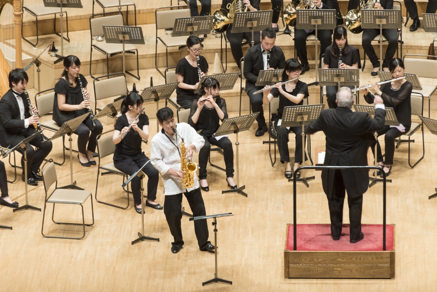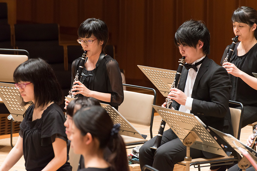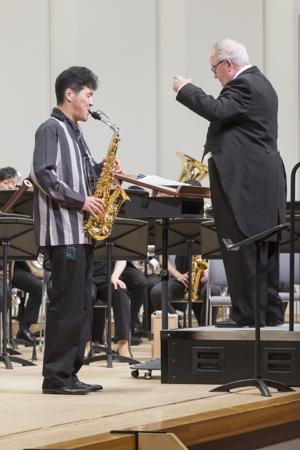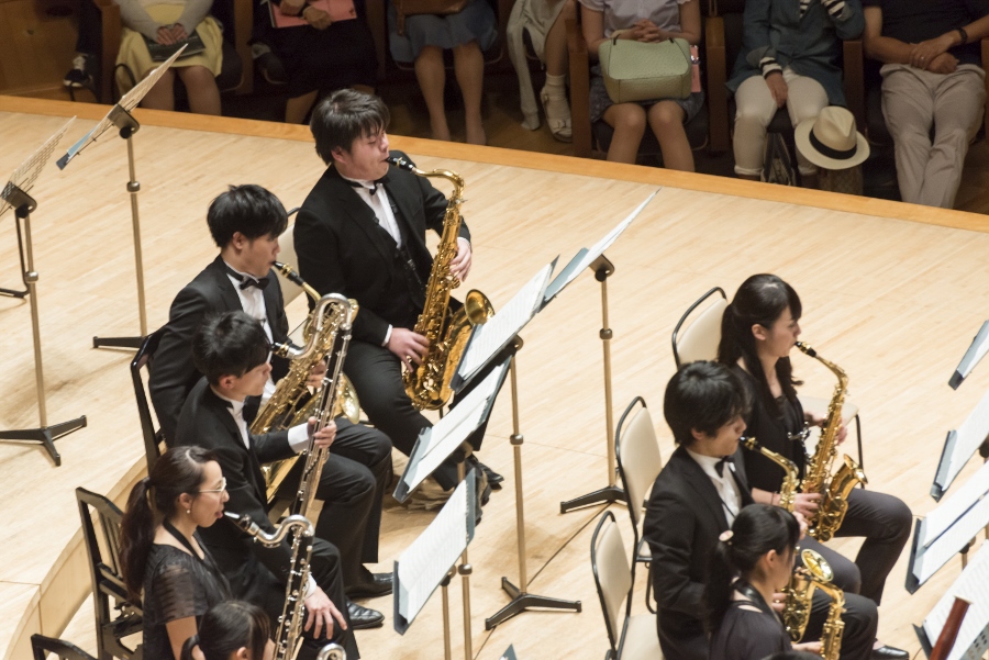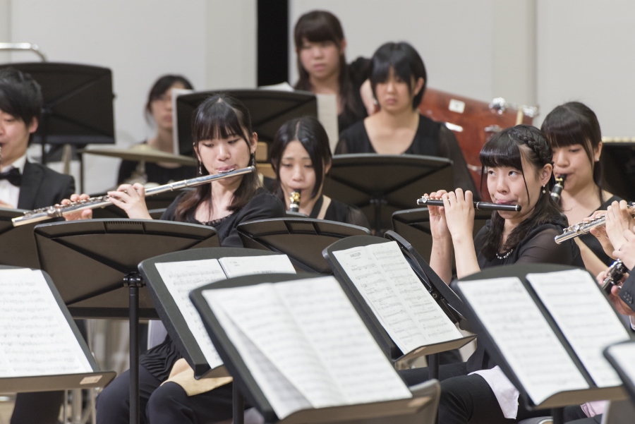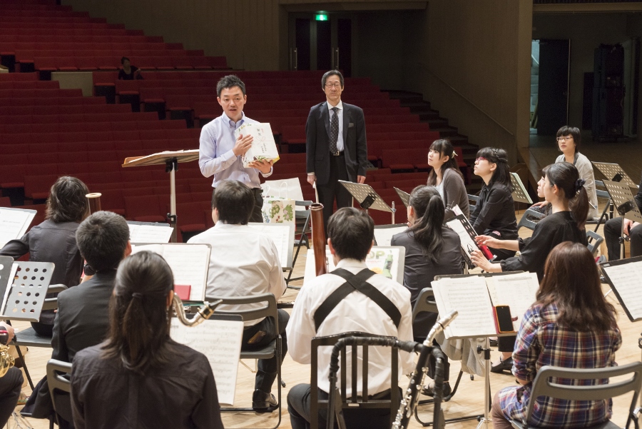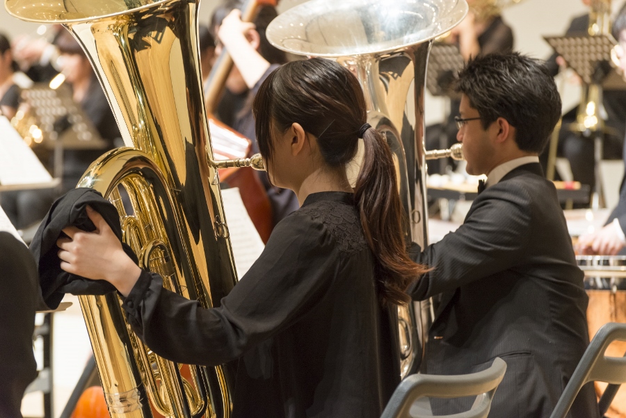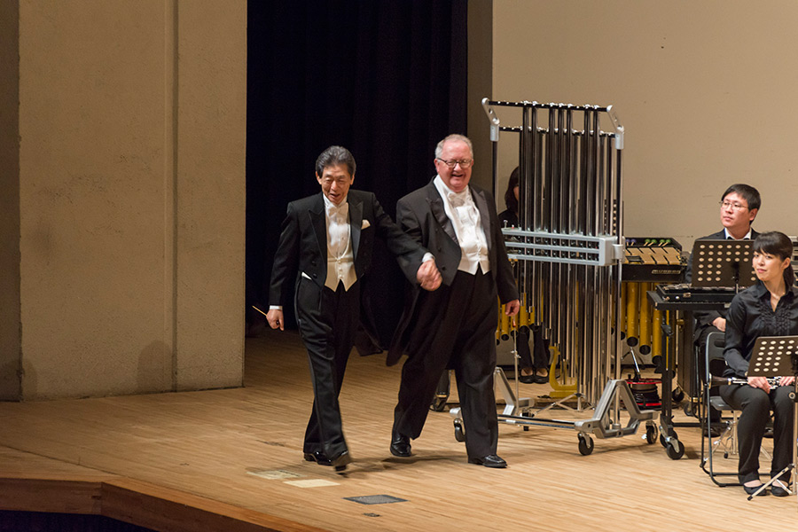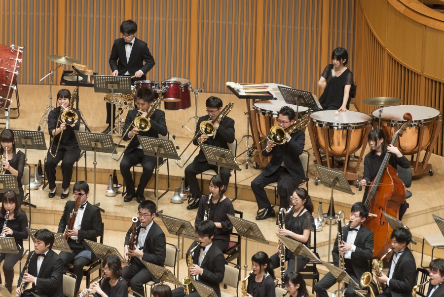 本学の創立90周年記念行事の一環として行われたこの演奏会では、指揮者に小澤 俊朗先生、世界的な作曲家 ジェイムズ・バーンズ氏をはじめ、日本を代表する演奏家であり、また本学の卒業生でもあるユーフォニアム奏者 外囿 祥一郎先生、サクソフォーン奏者 原 博巳先生にもソリストとして出演していただきました。