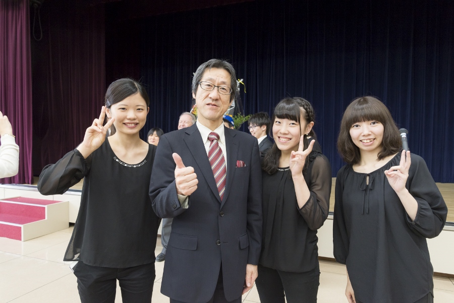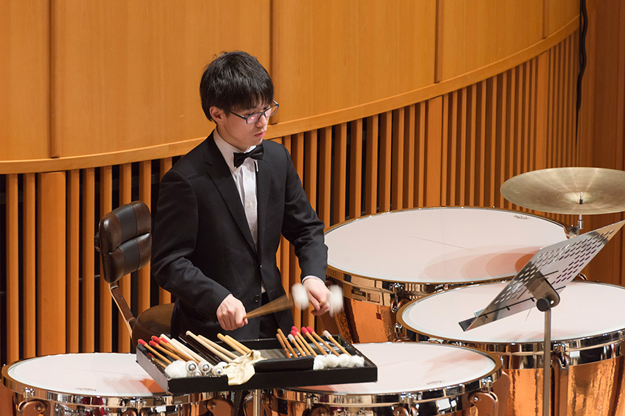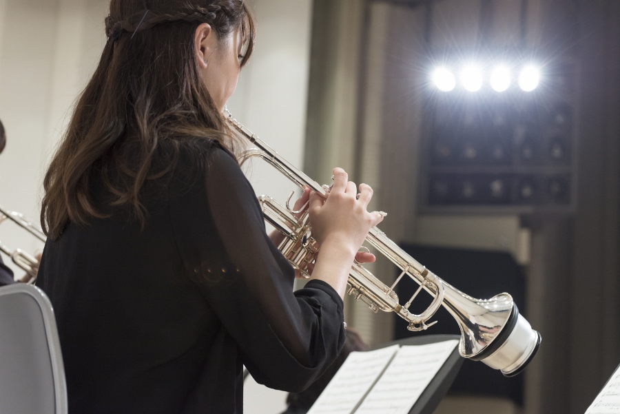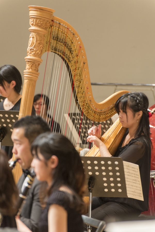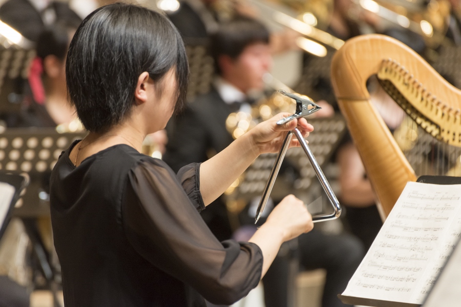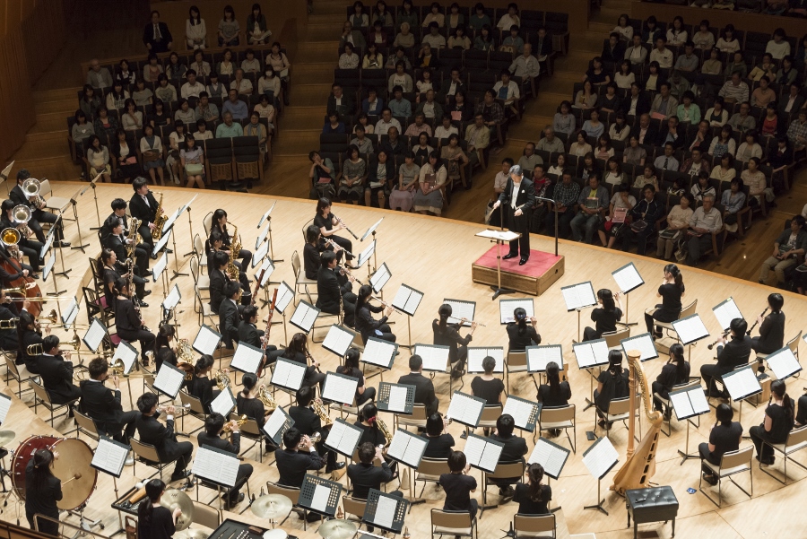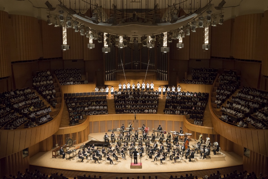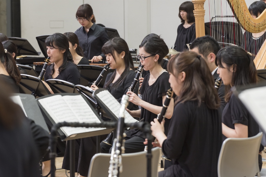 本学の創立90周年記念行事の一環として行われたこの演奏会では、指揮者に小澤 俊朗先生、世界的な作曲家 ジェイムズ・バーンズ氏をはじめ、日本を代表する演奏家であり、また本学の卒業生でもあるユーフォニアム奏者 外囿 祥一郎先生、サクソフォーン奏者 原 博巳先生にもソリストとして出演していただきました。